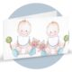 Foglio composto da n. 20 bigliettini per confetti in cartoncino bianco con stampa a colori di due gemelline con sonagli, ideale per nascita .