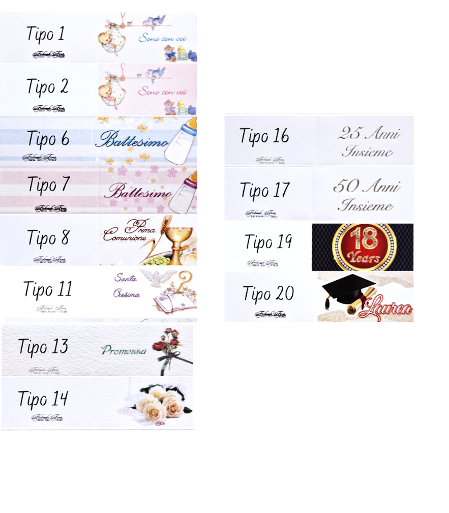 Bigliettini tutte le tipologie | Nessuno, Tipo 1 – nascita maschietto, Tipo 2 – nascita femminuccia, Tipo 8 Prima Comunione generico, Tipo 11 – Cresima con colomba, Tipo 13 – Promessa, Tipo 14 – matrimonio con fedi, Tipo 16 – anniversario 25°, Tipo 17 – anniversario 50°, Tipo 19 – Compleanno 18°, Tipo 20 – Laurea |
