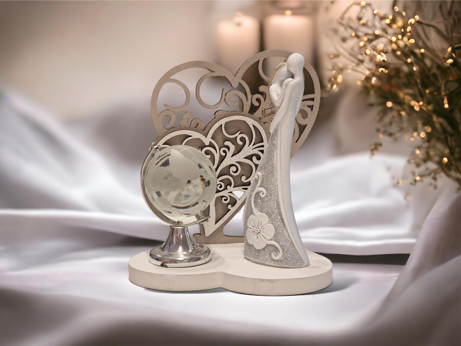 Elegante bomboniera per celebrare le nozze. Un tenero abbraccio per ricordare un giorno speciale con accanto un mappamondo rotante in vetro.
