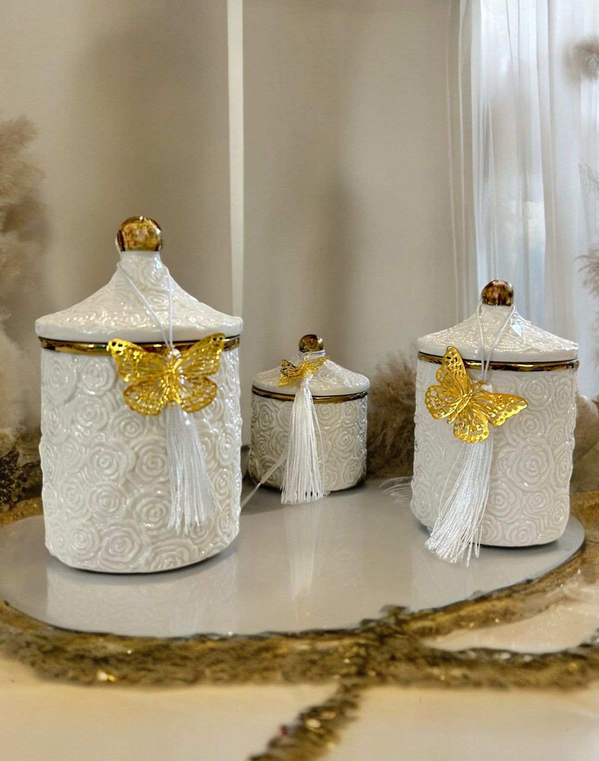 Eleganti potiche porcellana bianche ed oro con candela profumata con roselline in rilievo della linea Harmony disponibili in tre dimensioni .
