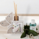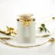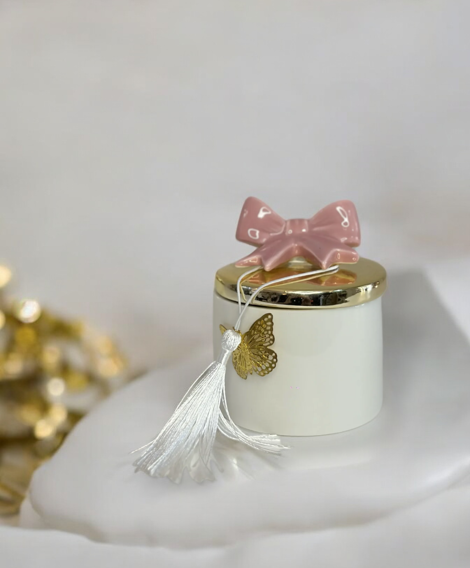 Eleganti potiche bianche ed oro con candela profumata con fiocco.
