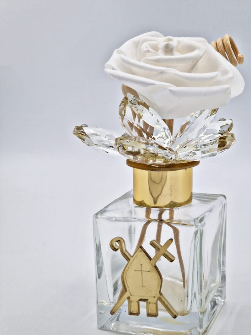 Elegante profumatore in vetro con inserti dorati raffiguranti mitra e pastorale.