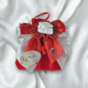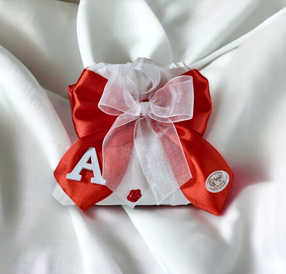 Sacchetto porta confetti in raso bianco con doppio fiocco in raso rosso e organza bianca.