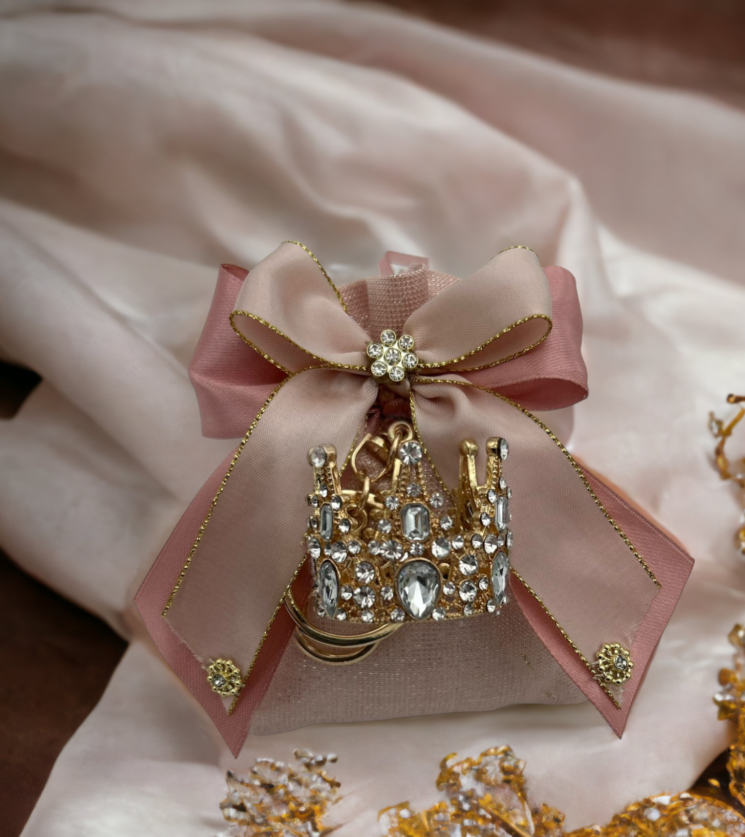 12 Ottobre 2023Elegante e raffinato sacchetto porta confetti in raso, impreziosito da una corona portachiavi