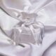 Sacchetto porta confetti raso bianco, con applicazioni.
